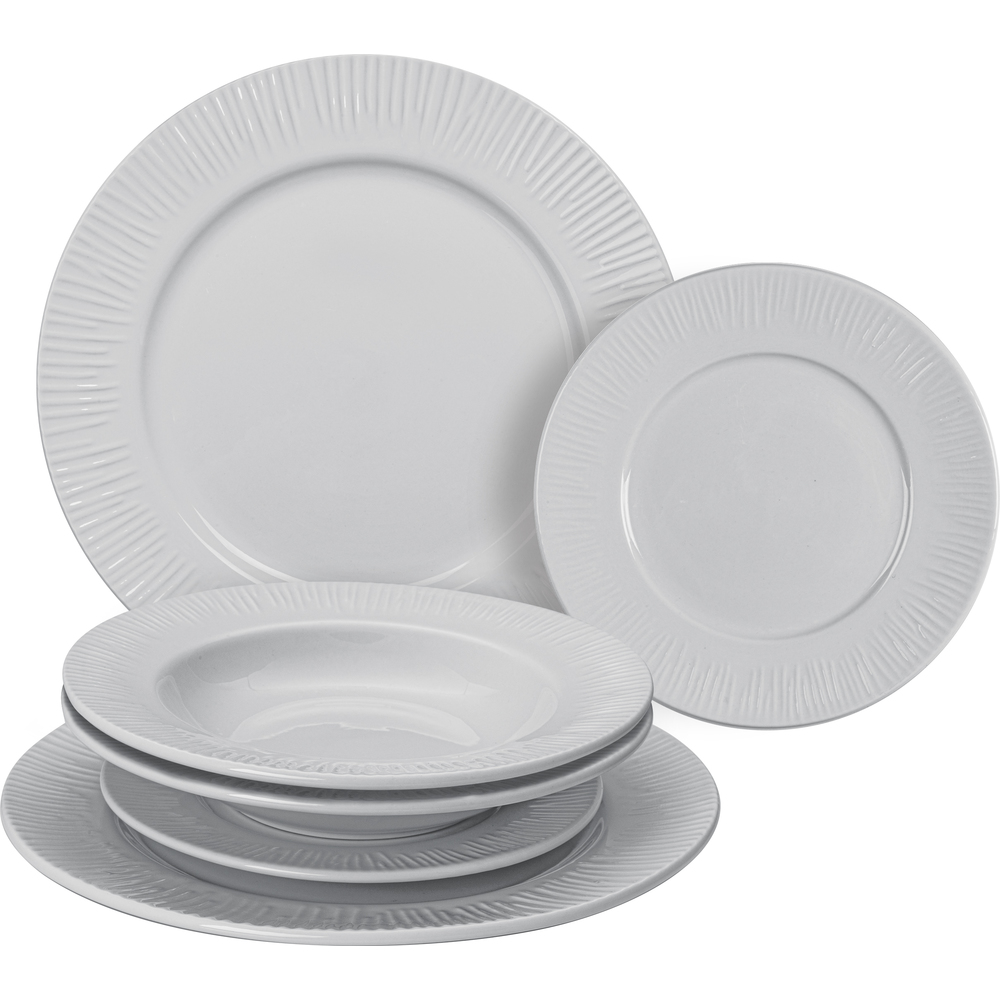 Komplet tanjura za objedovanje sadržava 2x plitka tanjura, 2x duboka tanjura i 2x tanjura za desert.