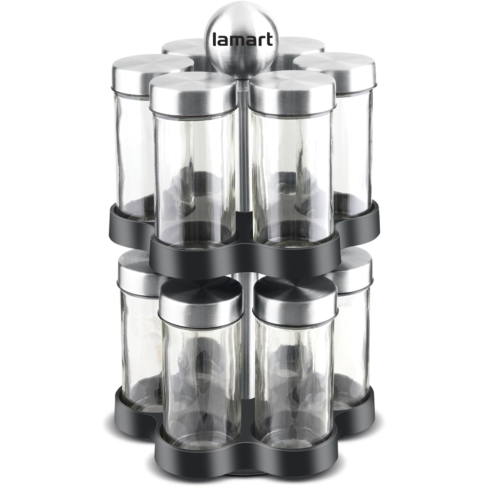 Komplet staklenki za začine na rotirajućem stalku od modernog dizajna.