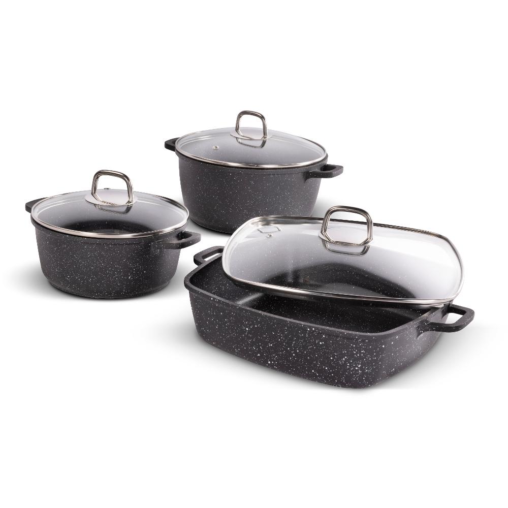 Posuđe je opremljen inedhezivnom površinom otpornom na grebanje i spaljivanje, debelim dnom s vrlo elegantnim ručkama za veću sigurnost, funkcionalnost i udobnost.