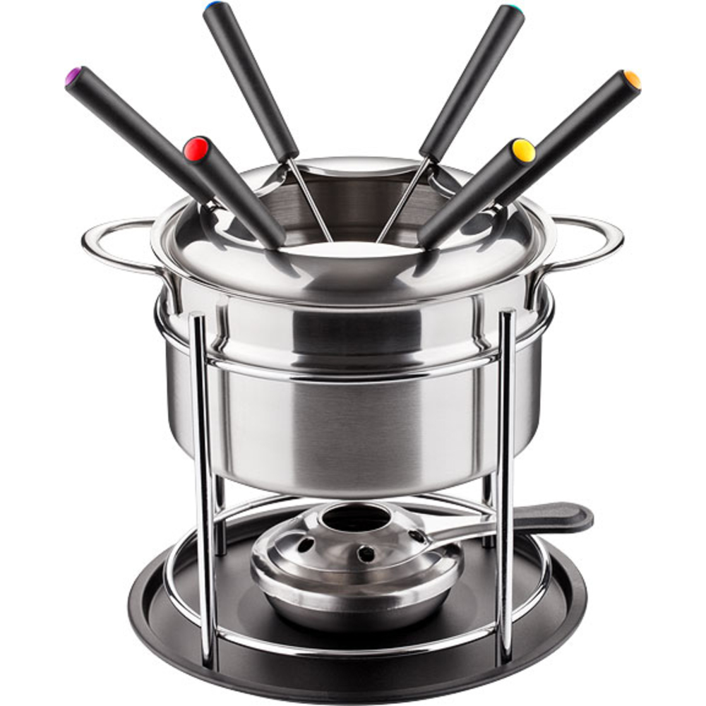 Ovaj komplet za fondu od nehrđajućeg čelika/emajla odličan je za pripremu i elegantno posluživanje fondua. Komplet sadrži: spremnik od nehrđajućeg čelika, 6 vilica u boji, poklopac i stalak za vilice, postolje i plamenik. Izrađeno od prvoklasnog čelika.